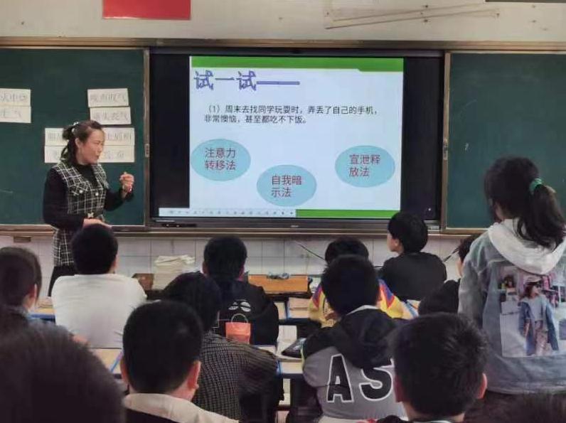 該校陶翠飛老師為大家展示了一節心理健康課《豐富多彩的情緒世界》。她以游戲的方式讓學生了解各種情緒,讓學生在輕松和諧的課堂氛圍中有所收獲。在了解“喜怒哀懼”四項基本情緒后,學生在討論和情境體驗中明白了消極情緒和積極情緒對自我行為發展的影響,萌發了“做自己情緒的主人”的意識。活動中陶老師還運用心理技術,讓學生說方法,說感受,說理解。整節活動中學生身心放松,參與度高,表現力強,收獲滿滿。