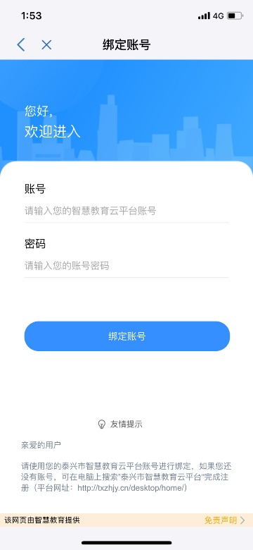 情況二:用戶有泰興市智慧教育云平臺賬號,且沒有綁定應(yīng)用,進入賬號綁定頁面,可輸入云平臺賬號和密碼,點擊【綁定賬號】完成綁定; 情況三:用戶有泰興市智慧教育云平臺賬號而且已經(jīng)綁定應(yīng)用,點擊應(yīng)用直接跳過賬號綁定頁面;