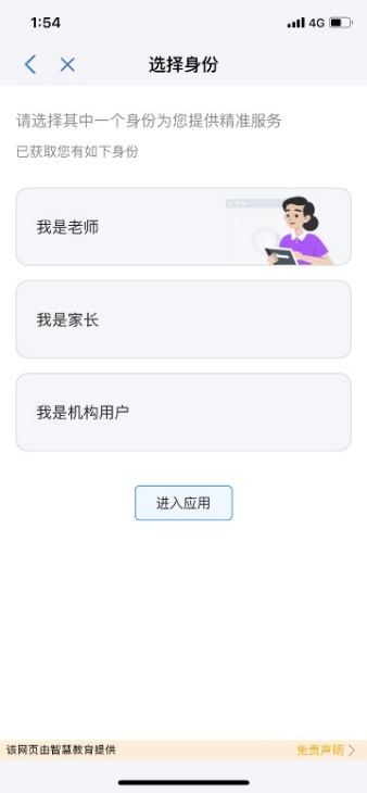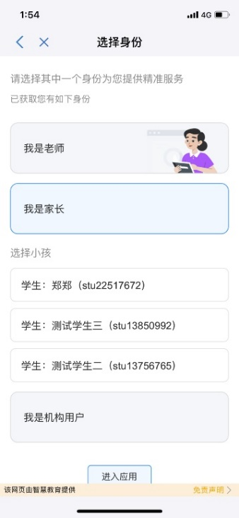 賬號綁定 選擇身份用戶登錄泰興一卡通APP,底部菜單點擊【生活服務(wù)】,在【校園教育】中點擊應(yīng)用,成功綁定賬號后,進入選擇身份頁面,有以下兩種情況:情況一:用戶綁定的賬號有多重身份,成功綁定賬號后,進入選擇身份頁面,用戶可選擇其中一個身份,點擊【進入應(yīng)用】;情況二:用戶綁定的賬號只有一重身份,成功綁定賬號后,跳過選擇身份頁面;