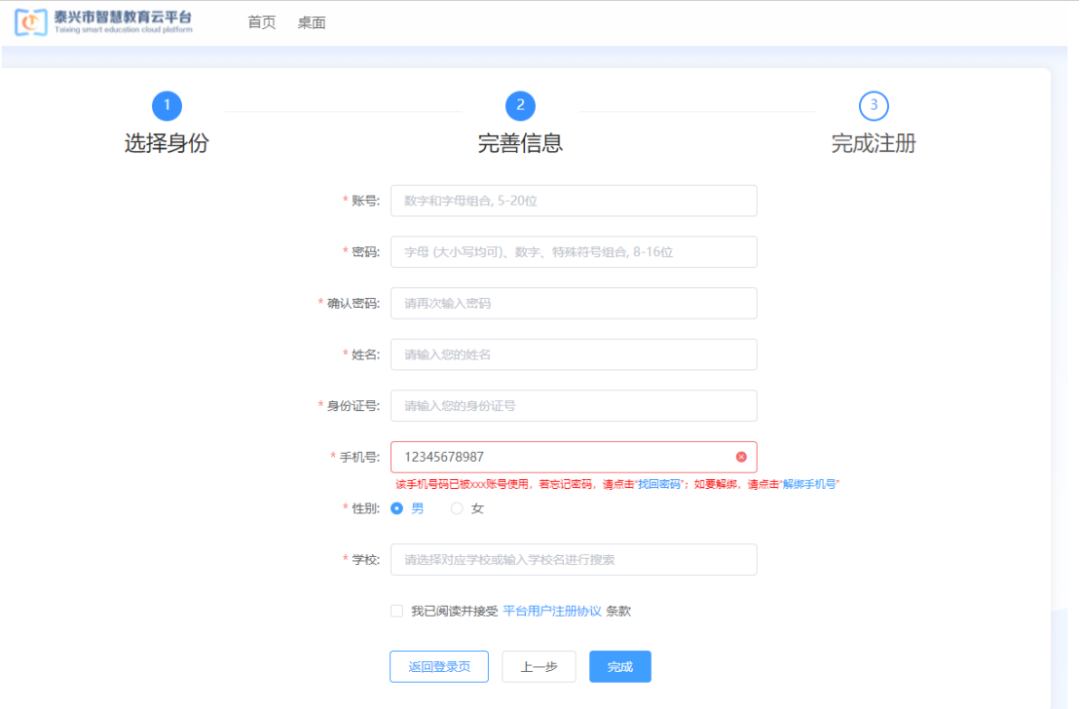 常見問題教師和家長在輸入手機號碼時,若手機號已被注冊過,有以下兩種情況:情況一:手機號被泰興云平臺注冊,則提示“ 該手機號碼已被xxx賬號使用,若忘記密碼,請點擊“找回密碼”;如要解綁,請點擊“解綁手機號””,找回密碼和解綁手機號是藍色字體跳轉(zhuǎn)鏈接;情況二:手機號被其他平臺注冊,則提示“該手機號碼已在其他學(xué)校平臺注冊,請前往https//pass.changyanm 使用手機號登錄查看學(xué)校平臺及賬號信息”;