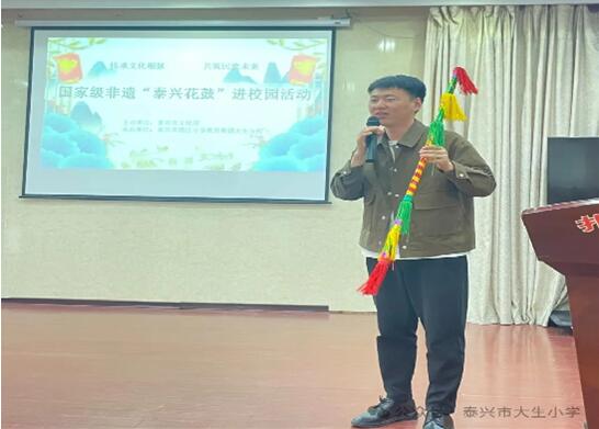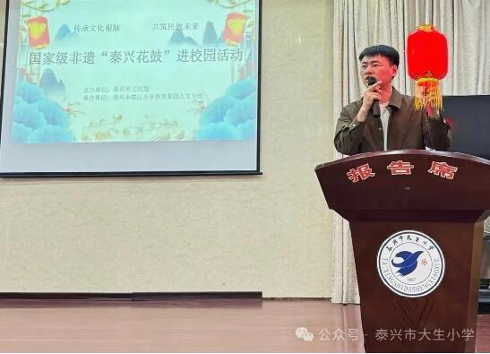(特約通訊員 符金花 祝朝陽)為慶祝中華人民共和國成立75周年,進一步保護和傳承好家鄉的非物質文化遺產,弘揚民族優秀傳統文化,豐富校園文化生活,促進青少年的健康成長,市大生小學特邀泰興市文化館的專家——泰興花鼓第八代傳承人胡盛主任走進校園,為少先隊員們呈現了一場既生動又特殊的藝術盛宴,更為春日校園注入了新的活力。