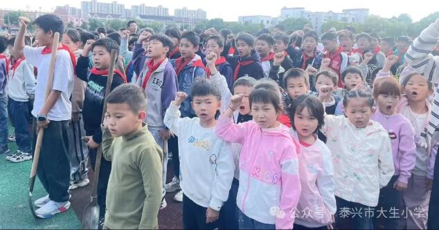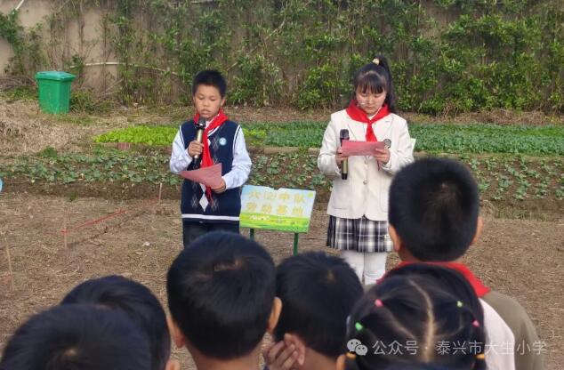 01 啟動 泰興市大生小學的孩子們手拿小鍬,齊聚操場東北角,望著眼前一塊塊試驗田,跟著小主持人一起宣誓“我愿辛勤勞作,尊重勞動,熱愛勞動,用雙手創造美好。”