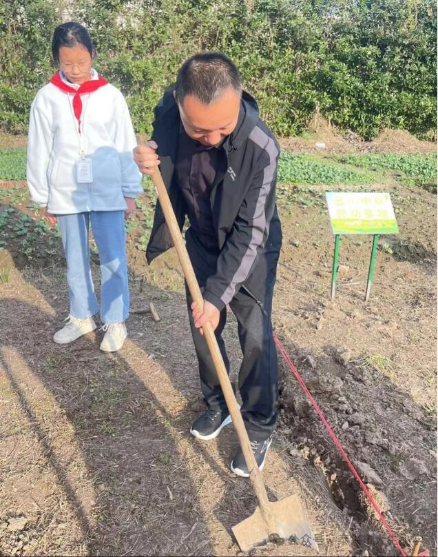 申校長親自邊講解邊示范如何用鐵鍬松土,邊上的孩子聽得認真,看得仔細,時不時還來個現場互動。