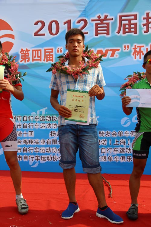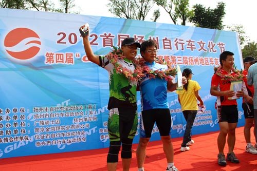 左一為選手程勇 。ㄓ浾 呂曉文)8月19日,由揚州市體育局主辦的2012首屆揚州自行車文化節、第四屆捷安特杯暨第二屆揚州地區車友山地車交流賽在揚州宋夾城遺址公園舉行。我市自行車運動協會作為友情合作單位組團參賽,最終,協會會員程勇奪得36-45周歲男子組冠軍,劉帥榮獲19-35周歲男子組第五名,蔣娟獲得女子組第六名的好成績。 據了解,這次比賽吸引了來自揚州、南京、淮安、泰州等地區的271名車友參加。這也是我市自行車運動協會組建后首次組團參賽,共派出了9名會員參加,泰州四市二區參賽者中,也唯有程勇、劉帥、蔣娟獲取名次,殷杰等六名會員獲得紀念獎。