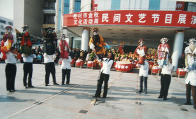 “笑爾胸中無一物,本來朽木制為身。衣冠也學詩文輩,面貌能驚市井人。得意那知當局丑,旁觀莫認戲場真?v教四肢能靈活,不借提撕不屈伸。”鄭板橋的《詠傀儡》一詩除了諷喻時俗外,也對木偶藝術作了惟妙惟肖的描繪。 “……凡事由人陰簸弄,此身枉自負昂藏。木偶也冠裳。”清末黃鼎銘《望江南百調》中也描寫了泰興木偶戲的演出情景。 唐韋旬《劉賓客佳話錄》記載:大司徒社公在維揚入市看盤鈴傀儡。盤鈴傀儡是一種在伴奏下表演的木偶戲。 這些都說明了當時這里木偶戲的盛行。 木偶戲,古稱傀儡子、魁儡子,亦稱傀儡戲。春秋戰國時期稱木偶為俑。始作喪家祭祀之用。從俑發展到傀儡戲,經歷了漫長的階段。湖南出土的樂俑就是一種殉葬品?芗词怯少傅男螤睿7氯嘶颢F的動態制作而成。關于這一點,在《續漢書 五行志》和《唐書 音樂志》中均有記載。唐代段安節《樂府雜錄》中有這樣的傳說:漢高祖劉邦起兵自登時,為匈奴單于冒頓所困,護軍都尉陳軍獻計,制木偶豎城頭以退兵?梢妰汕Ф嗄昵暗哪九季湍“歌”善“舞”。唐代傳至維揚地區。 泰興自古物產豐富,生產勞作之余,人們把看戲作為最佳消遣,使花費不多的民間小戲和木偶戲有了良好的生存空間和發展條件。清代乾隆年間,泰興有“蘇北木偶之鄉”的稱譽,其杖頭木偶與泉州的提線木偶、漳州的布袋木偶齊名。資料記載,泰興的杖頭木偶大約于清朝道光二十年(1840年)前從安徽傳入。 泰興杖頭木偶又被稱為“托偶”或者“托戲”,俗稱“三根棒”或是“三根棍”。是用三根木棒操縱。其中一根支撐木偶頭部,稱為主棒或面棒,耳、眼、鼻、嘴均能閉合張開,眼珠轉動,頭頸上下左右扭轉;另兩根棒操縱木偶人的雙手,又稱“手挑子”。表演時,演者兩手能運用自如、靈活準確地把握手中的各種道具,被稱為手挑子或手扦子。泰興杖頭木偶全長有一米左右,比一般同類木偶大,平底沒有腿,如果需要表演腿部動作,另制作雙腿由演員配合操縱,稱之為“配腿”或“配腳”。表演講究舉動、捻功和步功。操縱時,講究的是穩、準、正、平,并注意借鑒戲劇演員的水袖、步亮相、鷂子翻身等表演程式,以揭示劇中人物內心活動。 泰興杖頭木偶在歷史上有“神像”和“人像”兩大流派,在造型和表演方面各有特長。“神像”是方頭大耳,粗獷傳神;“人像”細膩逼真,近似真人。 木偶戲班多數是由家族成員組成實行家傳世襲的班主制。有時也雇傭一些木偶藝人,這些成員大多數是半農半藝,農忙時種地,農閑時唱戲。 木偶戲班多是在農家婚慶喜事、傳統節日、迎神賽會而應招前往助興。演出的場地不受限制,在場院、宅院、草坪上都可以演出。 民國時期,泰興木偶戲班最多時達117家,活躍于市井、鄉村。1959年,這些戲班合并為3個木偶劇團,演出范圍北至沈陽,南至湖南,東至長江兩岸,在上海大世界游樂場演出長達數月,頗受歡迎。1968年,各個木偶劇團調整合并為泰興縣木偶劇團,1971年,在蘇州市為西哈努克親王訪華團作專場演出。1973年,泰興木偶劇團被揚州地區接收,改名為揚州地區木偶劇團。但是仍有業余劇團活躍在泰興農村,代代相傳。一直到今天,我們還能在泰興農村看到木偶戲的表演。 木偶戲,由木偶、操縱演員、配音演員和樂隊四部分組成,多用戲曲曲調演出,有的用對話或歌舞表演。從前木偶造型比較機械,表演古裝戲的木偶僅由三根棒構成,身軀干癟,目瞪口呆,有膀無腿。后來經過泰興木偶工廠技師的精心設計,使木偶的人物形象生動,個性特別鮮明,表演時有喜怒哀樂的感情,有輕柔堅強的動作,有能唱善白的語言,木偶的頭、眼睛、嘴巴、手、足都能活動自如,唱白時嘴巴隨著曲調的旋律啟閉,眼睛也隨著表演的動作轉動。從目光、動作可看出木偶是高興,還是憂愁,是憤怒,還是憎恨。木偶的手,送物取件,擊鼓彈琴,騎車劃船,躍馬揚鞭,皆能動作敏捷,還能自己打火抽煙。人們稱贊說:木頭人,木頭人,真正像個人!木偶戲,木偶戲,活像真人在演戲。 泰興木偶戲初從安徽傳入時,唱腔為徽腔,后改為京劇,并逐步發展,形成了平穩剛勁、細膩傳神的藝術風格。 泰興木偶戲的劇本均為口頭傳承,保留了民間鮮活的語言,在文學性基礎上,兼具民間性。泰興木偶戲劇目豐富,在保留劇目(含折子戲)中,既有京劇傳統劇目,神話劇目,也有現代戲。 木偶服裝均由藝人自行設計,鄉間裁縫縫制,這樣能節約成本。 所用樂器有京胡、二胡、鼓、鑼、拔子等,主要是祖傳得來的,也有部分是購買的。 泰興杖頭木偶均系祖傳,最真實地保留了杖頭木偶這一融雕刻藝術和操縱藝術于一體的綜合藝術的“文物道具”。 在傳統節日中,如春節、元宵節等人們都會請來戲班熱鬧一下。或者家中有大事,如生子、進宅、祝壽、孩子考取大學等,還有為生病痊愈或是為其他事酬神還愿的也要請來戲班祝賀,另外喪事出殯也有請戲班子的,以酬謝賓客。全村莊的男女老少,以及外村莊的都可以前去觀看。 劇團一般把臺面做成樓臺式小舞臺,二米多高,三米多寬,搭在村頭的空地和打麥場上,也可在鄉村集市的綠樹叢中。到要開演時,“主家”即邀請者,便燃放起“天地響”和“長鞭”,告知鄉親們,戲班演出即將開始了。有的人家還在村口遠遠地插上彩旗,一路上一直插到演出場所,把賓客引到戲臺前。戲班正式開演時,民眾常常會要求加演“跳加官”
