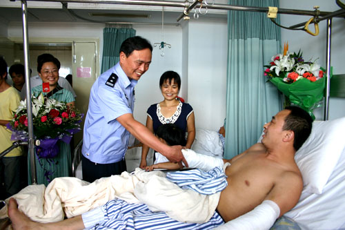 7月29日,市公安局派員專程赴浙江臺(tái)州,看望因見(jiàn)義勇為遭犯罪嫌疑人報(bào)復(fù)受傷的我市市民李祥,并送去了慰問(wèn)金。 現(xiàn)年35歲的李祥是我市新街鎮(zhèn)李蕩村人,1993年,他帶著妻子來(lái)到浙江省臺(tái)州市路橋區(qū)打工,今年7月20日晚,李祥及時(shí)舉報(bào)并配合治安人員抓獲三名企圖實(shí)施盜竊的犯罪嫌疑人,21日晚8時(shí)被釋放的三名犯罪嫌疑人糾集十多名操外地口音的男子,對(duì)李祥連砍數(shù)刀,致其多處受傷。李祥的行為在當(dāng)?shù)匾鹆松鐣?huì)各界的極大關(guān)注,當(dāng)?shù)攸h委政府對(duì)其行為給予了高度肯定,媒體也對(duì)此事件進(jìn)行了跟蹤報(bào)道,許多當(dāng)?shù)厥忻褡园l(fā)地帶著獻(xiàn)花和捐款到醫(yī)院看望李祥。27日上午,我市公安局局長(zhǎng)姜文湘從媒體獲知消息后,隨即派工會(huì)主席侯明德赴浙江臺(tái)州看望李祥,帶去家鄉(xiāng)人民的問(wèn)候,并送去了2000元慰問(wèn)金。 另?yè)?jù)了解,李祥于2002年、2004年先后兩次見(jiàn)義勇為,分別被路橋區(qū)人民政府評(píng)為見(jiàn)義勇為先進(jìn)人物一等獎(jiǎng)、三等獎(jiǎng),日前,從臺(tái)州警方傳來(lái)消息,7月30日,涉案的三名主要犯罪嫌疑人已全部落入法網(wǎng),目前,此案仍在進(jìn)一步審理中。 圖為:市公安局工會(huì)主席侯明德在醫(yī)院看望泰興的好青年李祥。 (陸裕順) |