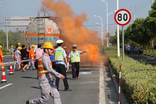 為深刻吸取江蘇德橋倉儲(chǔ)有限公司“4·22”火災(zāi)事故教訓(xùn),著力解決危險(xiǎn)化學(xué)品道路運(yùn)輸安全工作中存在的突出問題,堅(jiān)決防止發(fā)生重特大道路交通事故,切實(shí)保障人民群眾生命財(cái)產(chǎn)安全,7月21日,泰興公安交警大隊(duì)在泰興市悅達(dá)危險(xiǎn)品運(yùn)輸有限公司開展了由虹橋鎮(zhèn)綜治辦、中丹集團(tuán)消防隊(duì)以及轄區(qū)新昌、泰華、太平洋危險(xiǎn)品公司等多部門聯(lián)合舉辦的危化品道路運(yùn)輸泄漏事故應(yīng)急救援演練。此次演練的內(nèi)容設(shè)定為在S232省道,悅達(dá)危險(xiǎn)品公司一輛滿載有危險(xiǎn)化學(xué)品的槽罐車從專用停車場出發(fā),行駛至S232-28km處被另一輛肇事貨車追尾,導(dǎo)致危險(xiǎn)品槽罐車閥門受損,引發(fā)危險(xiǎn)品泄漏的事故。事故發(fā)生后,虹橋交警中隊(duì)調(diào)動(dòng)警力迅速對現(xiàn)場交通進(jìn)行管制,同時(shí)立即向上級(jí)部門領(lǐng)導(dǎo)匯報(bào),啟動(dòng)應(yīng)急聯(lián)動(dòng)機(jī)制,調(diào)集相關(guān)聯(lián)動(dòng)單位到場配合。消防處置力量到場后,按照泄漏事故處置要點(diǎn)通過偵查檢測、警戒疏散、生命救助和稀釋驅(qū)散等戰(zhàn)斗環(huán)節(jié),在參戰(zhàn)聯(lián)動(dòng)單位積極配合下,經(jīng)過一個(gè)小時(shí)戰(zhàn)斗成功處置險(xiǎn)情。