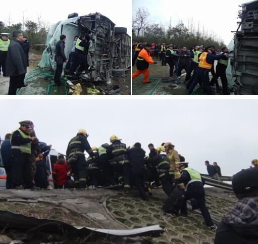 2月7日15時30分左右,泰興公安交警大隊新街中隊得知有一輛車牌號位蘇E5T**0的大客車從鹽靖高速元竹段翻下護欄,翻在元竹某村農(nóng)田里。警情就是命令,獲悉情況后,中隊負責人迅速組織全體警力趕赴現(xiàn)場,開展救援工作,用警戒帶封閉現(xiàn)場,對卡在駕駛室的駕駛員和受傷的乘客進行救助,最終通過與消防人員的密切配合,救援成功,該車上54名乘客,無一人死亡。 經(jīng)了解,該車系從蘇州開盱眙方向,在高速與其他車輛發(fā)生事故后,車輛失去控制撞斷護欄后翻落到農(nóng)田里。 (王全智 黃新麗) |