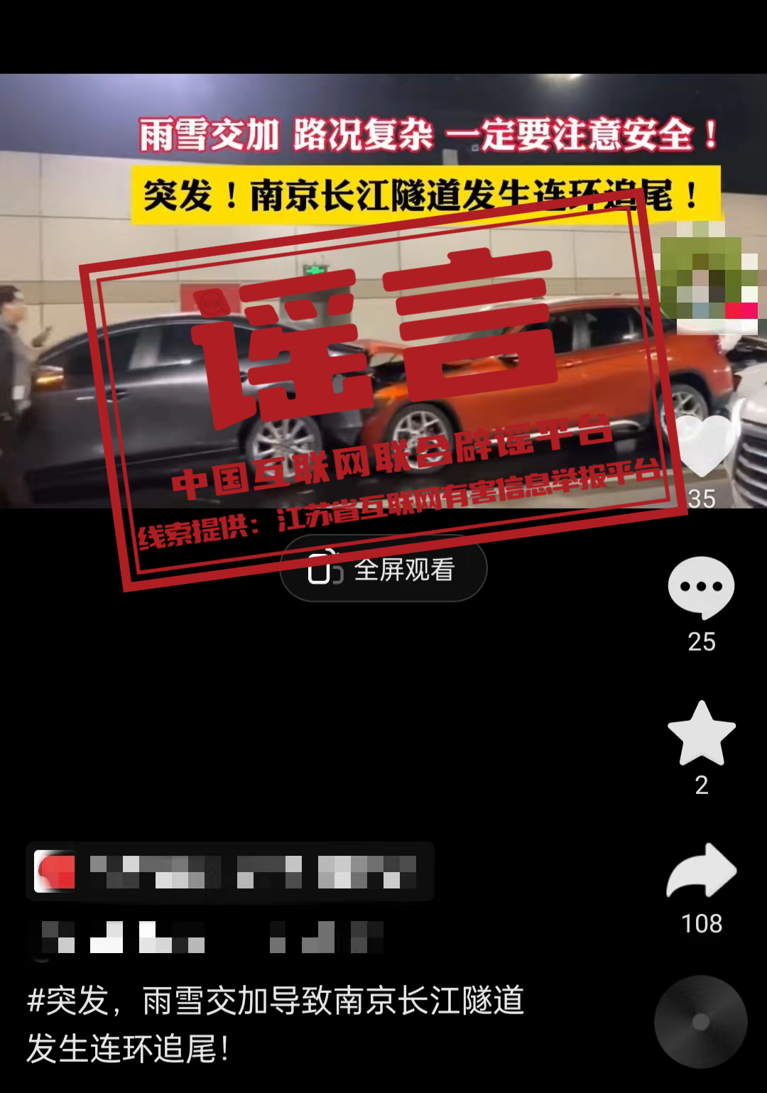真相:12月18日,南京普降大雪,網(wǎng)上流傳一條關(guān)于“過(guò)江隧道多輛汽車(chē)連環(huán)追尾”的視頻,并以此提醒網(wǎng)民“下雪天注意路滑”“能不開(kāi)車(chē)就不開(kāi)車(chē)”,引發(fā)關(guān)注。經(jīng)向公安部門(mén)核實(shí),視頻中的事故發(fā)生在2021年4月1日南京江山大街隧道內(nèi)。截至目前,南京市各隧道內(nèi)暫未發(fā)生較大交通事故。 在此提醒廣大網(wǎng)民,不隨意轉(zhuǎn)發(fā)沒(méi)有權(quán)威和正規(guī)來(lái)源的截圖、視頻、音頻信息。不傳謠、不信謠,共同營(yíng)造清朗網(wǎng)絡(luò)空間。(來(lái)源:江蘇省互聯(lián)網(wǎng)有害信息舉報(bào)平臺(tái)、“南京網(wǎng)絡(luò)辟謠”微信公眾號(hào))