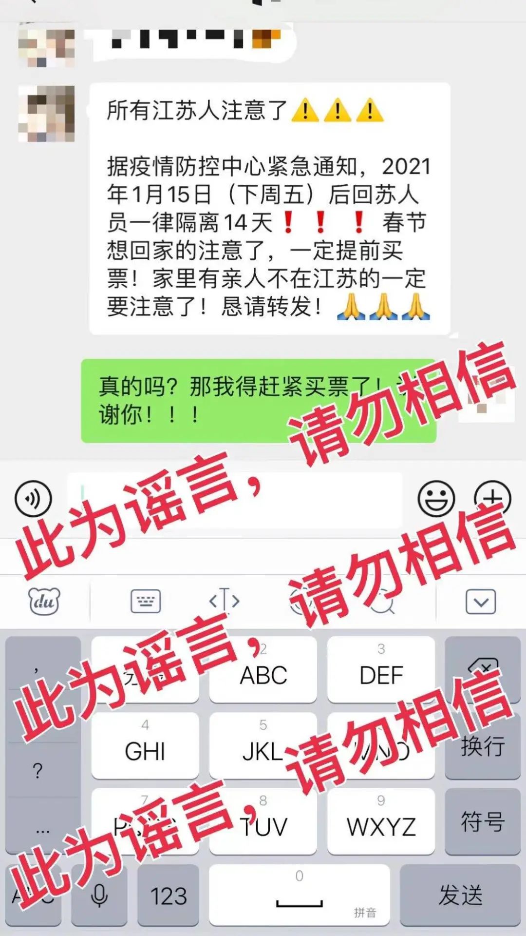 臨近春運,疫情防控形勢日益嚴峻,與返鄉(xiāng)回程相關(guān)的謠言開始出現(xiàn)。日前,就有一條關(guān)于來蘇返蘇人員入蘇隔離的信息在微信等社交媒體上傳播開來。
