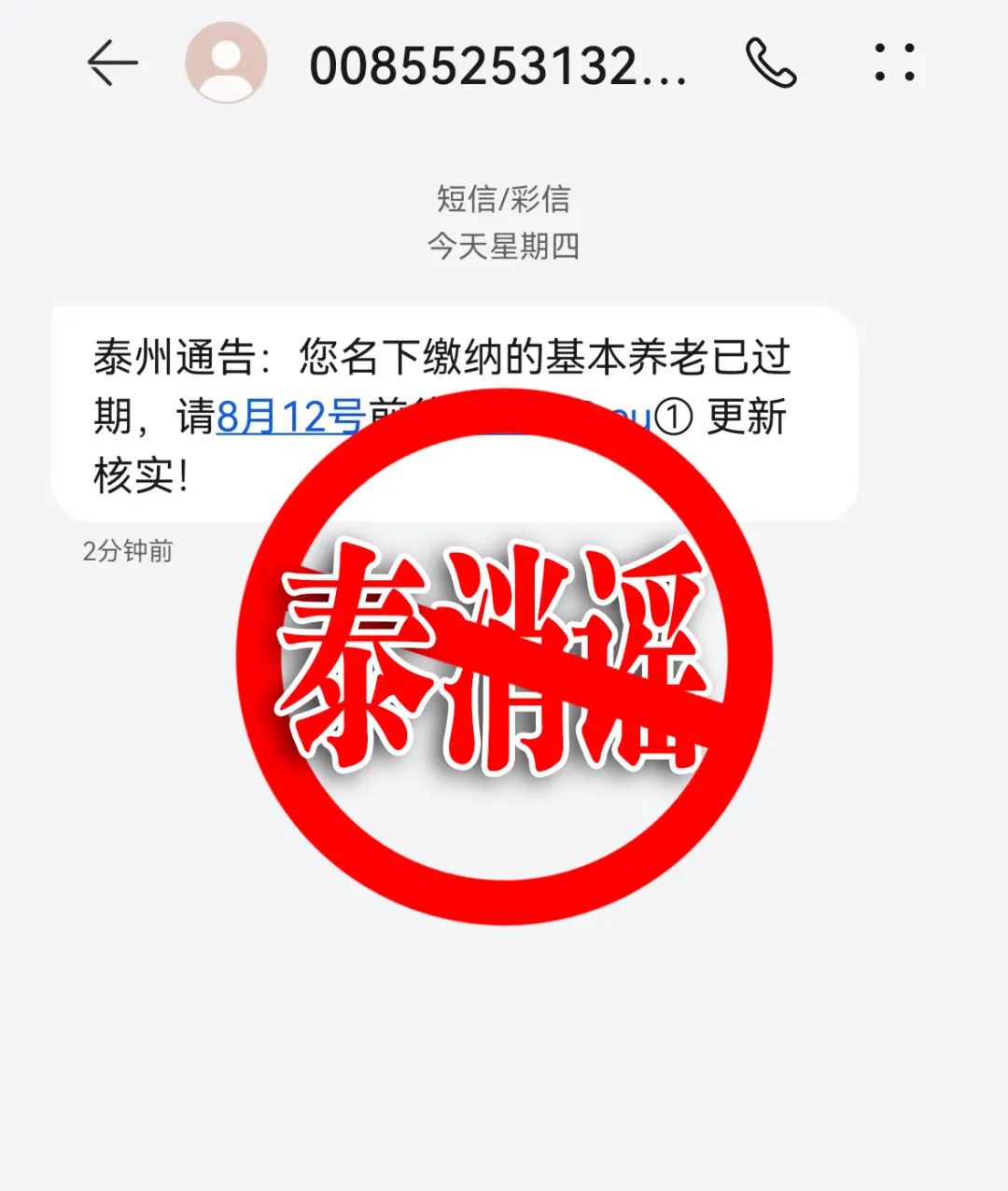 日前 不少人收到一條短信 內容如下: 泰州通告:您名下繳納的基本養老已過期,請8月12號前往tz.*****.eu更新核實! 記者聯系泰興市社保中心 經工作人員鑒定 此系謠言