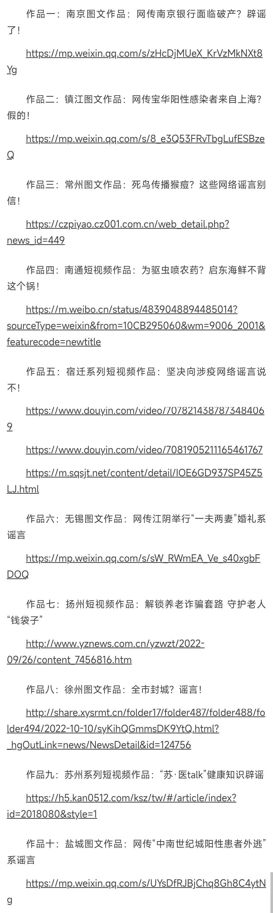為宣傳展示2022年度全省網絡辟謠工作成效,調動社會各方力量參與網絡辟謠工作的積極性和主動性,提高社會公眾識謠辨謠能力和媒介素養,推動形成全社會共同抵制、共同治理網絡謠言的良好氛圍,江蘇省委網信辦近期組織開展了2022年度“全省網絡辟謠優秀作品”征集評選活動,現將評選結果予以公布: