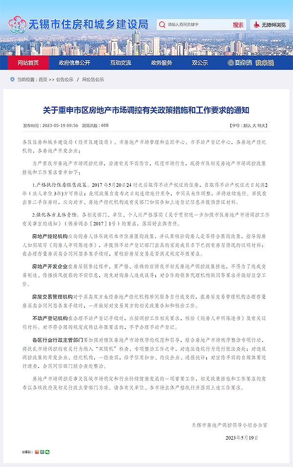 5月19日,無錫市住建局官網發布《關于重申市區房地產市場調控有關政策措施和工作要求的通知》,澄清有關不實傳言,明確當地住房限售政策未作調整,并將繼續施行,不滿兩年依舊不能過戶: