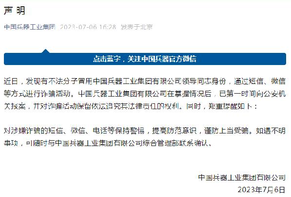 (圖片來源:“中國(guó)兵器工業(yè)集團(tuán)”微信公眾號(hào)截圖) 真相:中國(guó)兵器工業(yè)集團(tuán)有限公司發(fā)布聲明稱,近日,發(fā)現(xiàn)有不法分子冒用中國(guó)兵器工業(yè)集團(tuán)有限公司領(lǐng)導(dǎo)同志身份,通過短信、微信等方式進(jìn)行詐騙活動(dòng)。中國(guó)兵器工業(yè)集團(tuán)有限公司在掌握情況后,已第一時(shí)間向公安機(jī)關(guān)報(bào)案,并對(duì)詐騙活動(dòng)保留依法追究其法律責(zé)任的權(quán)利。鄭重提醒公眾接到涉嫌詐騙的短信、微信、電話要保持警惕,注意核實(shí)信息,避免上當(dāng)受騙。(來源:“中國(guó)兵器工業(yè)集團(tuán)”微信公眾號(hào))