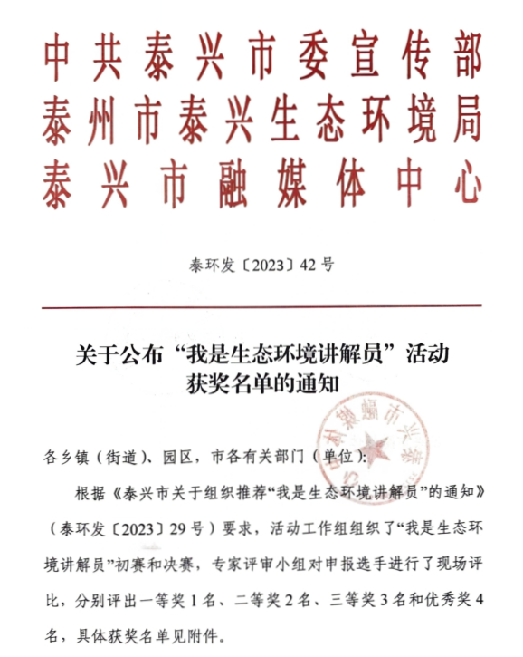 經過初賽和決賽,評審小組現場評出了一等獎1名、二等獎2名、三等獎3名、優秀獎4名。據悉,“我是生態環境講解員”的頒獎儀式,將在6月5日“泰興市紀念2023年世界環境日暨第五屆環保文化節”中舉行。