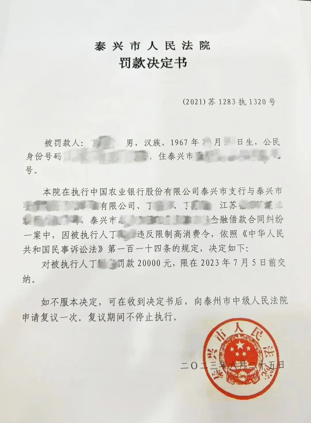 日前,最高人民法院印發《關于開展打擊被執行人違反限高令乘機專項整治行動的通知》,丁某的出行情況赫然出現在《違反限高令乘機人員名單》中。 泰興法院立即核實相關情況,確定丁某存在違法情形,應予懲戒。經傳喚后,丁某迫于執行壓力,對違反限高事實供認不諱。根據丁某的行為情節,泰興法院決定對其處以20000元罰款。丁某表示對罰款決定無異議,自愿接受處罰,并當場繳納罰款。