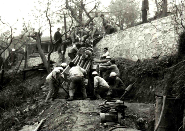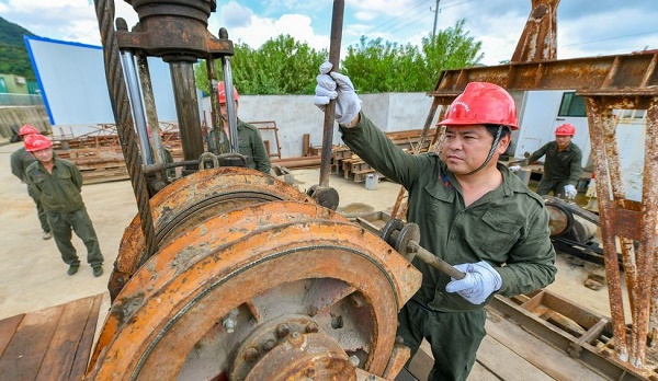 老一輩江蘇地礦人在搬運(yùn)施工機(jī)械
