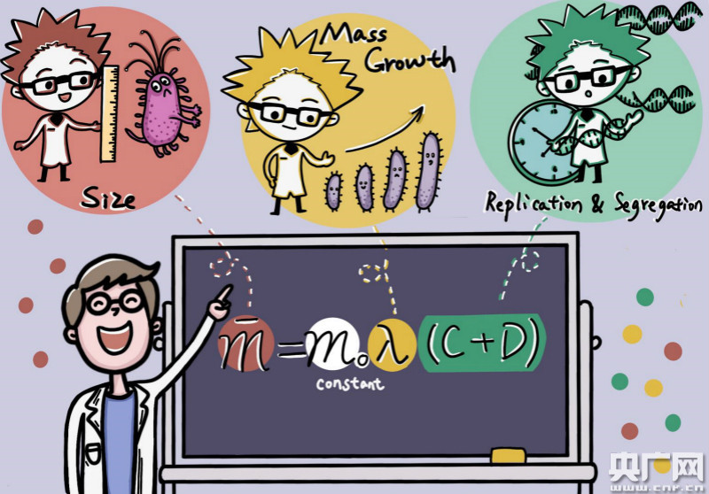 個體生長分裂方程示意圖(央廣網發 深圳先進院供圖) 新的方程統一了不同生長速率條件下的細菌細胞周期調控機制,這一定量公式的提出也使得細菌個體大小、生長速率等自然現象具有了一定的可預測性。例如:當得知細菌生長速率和DNA復制周期,便可準確預測出細菌的大小。該分裂方程為研究人員提供新的研究范式和思維方法,解答細菌細胞大小和DNA復制周期以及生長速度之間的關系,并具有廣泛的應用價值。 “個體生長方程”對理解細菌細胞周期的控制機制有什么意義呢?在“個體生長方程”的約束下,研究團隊對細菌細胞分裂的控制機制進行了探討,并以此為基礎提出了一個全新的分子機制假說,認為存在一種“分裂許可物”,它與“細胞生長”和“染色體復制分離”相關。當它積累達到一定閾值時,細胞就會分裂。研究團隊在此基礎上建立了相應的數學模型,進一步的實驗確實驗證了理論預測。 從數學公式到建構生命體理性設計基礎 在物理世界,“伯努利方程”指導了飛機的設計,“阿基米德浮力定律”推動了潛艇的面世,“牛頓第二定律”是人類得以翱翔太空的理論基石,合成生物學的終極目標就是生物世界實現理性設計、改造現有生命形式或者創造全新的生命形式以滿足人類不同的需求。 以“合成生物學”為研究導向,劉陳立團隊繼去年揭示細菌群體遷徙公式后,該研究是在定量生物學領域的再度突破,“研究再次證實了定量的思維方法在生命科學研究中的重要性,我們找到的每一個運行規律,都是試圖找到可用于指導設計、改造、重建生命形式的‘圖紙’。”劉陳立表示。此次對細菌個體細胞相關定量規律和法則的基礎科學問題研究,對人類揭示并理解生命體內在原理提供了重要的參考依據,此研究也有助于未來合成生物學領域的理性設計和建構,以滿足細菌治療疾病、抗生素替代、綠色生物制造等多個應用層面的需要。 |
