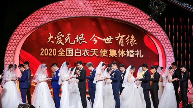 新華網(wǎng)南京5月20日電(龐雪。┐髳(ài)無(wú)垠,今世有緣。5月20日,江蘇今世緣酒業(yè)攜手江蘇省廣播電視總臺(tái),在南京為抗擊新冠肺炎疫情推遲婚期的醫(yī)務(wù)工作者舉辦了一場(chǎng)特殊的集體婚禮。