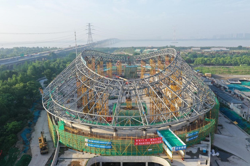 杭州亞運輪滑館輪廓初顯(央廣網發 杭州亞組委供圖) 項目總建筑面積約36000平方米,內含國際輪滑協會最新200*7米標準速度輪滑賽道和50x25m花樣輪滑比賽場地,設有觀眾席約1600個。周邊防護綠地約132畝,毗鄰錢塘江畔,凸顯杭州亞運會“綠色”理念。 輪滑館屋蓋下豎向受力構件采用鋼桁架結構,屋蓋采用馬鞍形預應力索網結構,施工難度不小。工程分為20個內環、中環、外環和50個徑向組合,每個拼裝塊均不重復,施工過程中需全站儀逐一放點、放線。要求精度高、復核量大,且主構件拼裝組合體一次提升定點就位,需精確確定支撐點,空間位置一次就位準確,才能確保后續連接組合準確就位。為確保項目能在規定時間內高質量完成,亞組委場館建設部項目積極協調各方,幫助解決技術難題。 |