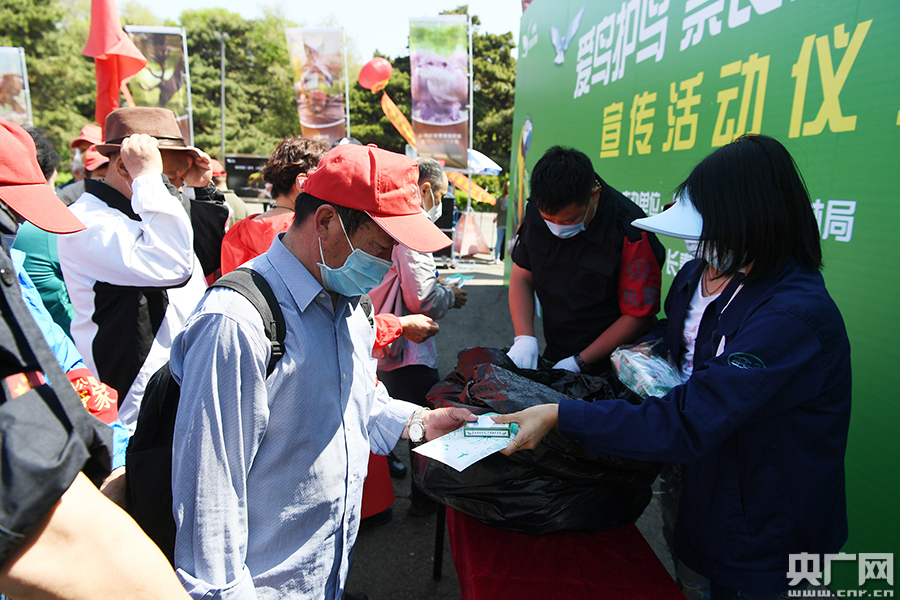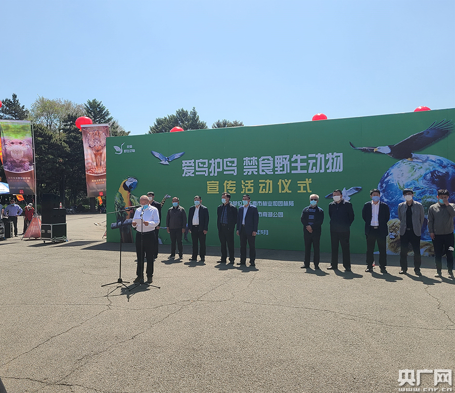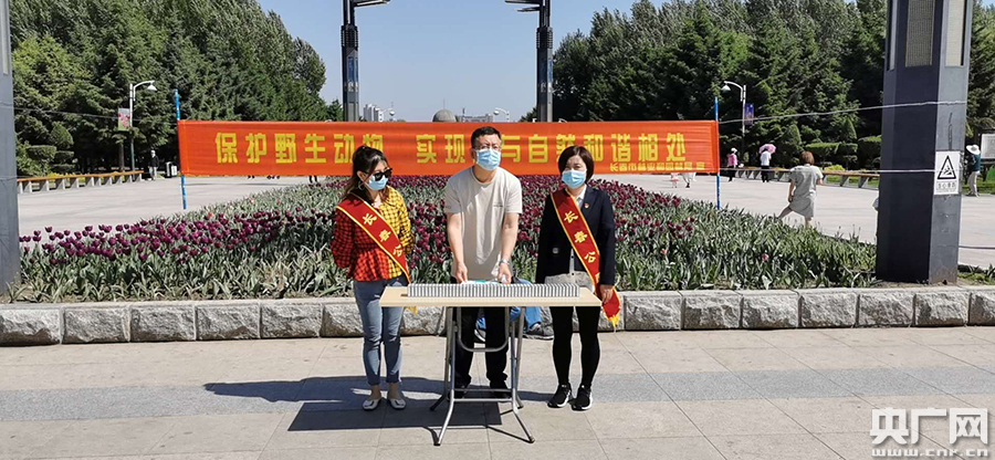 在長春公園分會場進行的宣傳活動(潘曉威 攝) 央廣網(wǎng)長春6月1日消息(記者于中濤 通訊員魏靜)“沒有食用,就沒有買賣,也就少了傷害。讓我們攜手共進,一同保護野生動物,拒絕食用野生動物”。近日,“愛鳥護鳥 禁食野生動物”主題宣傳活動在吉林省長春市南湖公園舉行,38名志愿者齊聲向廣大市民發(fā)出禁食野生動物和保護野生動物的倡議。 此次宣傳活動由長春市林業(yè)和園林局主辦,宣傳活動的主會場設(shè)在長春市南湖公園,在長春市勝利公園、長春公園、百花園等7處園林和休閑場所也同時開展了宣傳活動。
