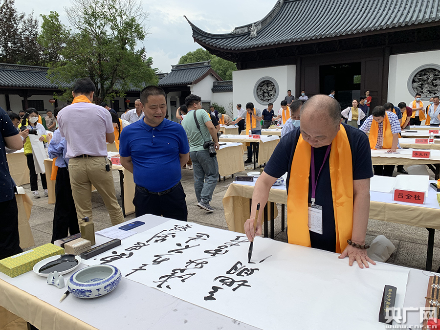 金庭筆會(央廣網記者 張國亮 攝) 后世文人墨客來此探尋書圣足跡,留下了不少佳作絕句,并演變成獨特的“書圣文化”。自2004年以來,嵊州市已成功舉辦16屆書法朝圣節。書法朝圣節將書法文化和祭祀文化相結合,創造出新型的文化傳承載體,促進了傳統文化的繼承和發展,打造出了文化旅游的新品牌,成為嵊州一大文化和旅游特色。