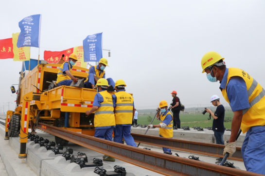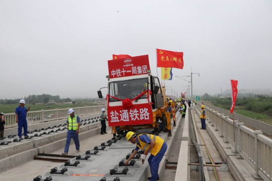6月12日,鹽通高鐵東臺站施工現場,鋪軌機牽引著一組500米長鋼軌平穩地落在無砟道床上,此舉標志著國家“八縱八橫”高速鐵路主通道之一的鹽通高鐵工程建設整體從線下施工轉入到線上鋪軌階段。