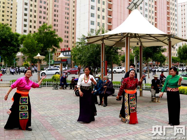 平安區(qū)化隆路社區(qū)各族居民在跳藏族舞蹈“鍋莊”(央廣網(wǎng)發(fā) 張雷攝) “中華民族大家庭,五十六朵花簇?fù)恚值芙忝檬且患遥巳硕紣畚抑腥A……”伴隨著悠揚(yáng)婉轉(zhuǎn)的青海賢孝,社區(qū)民樂隊(duì)正在文化活動(dòng)室彈唱《民族團(tuán)結(jié)一家親》。 樂隊(duì)隊(duì)長(zhǎng)達(dá)明勝退休前是海東市互助土族自治縣一所中學(xué)的校長(zhǎng)。這首青海賢孝曲調(diào)的《民族團(tuán)結(jié)一家親》是他填詞作曲,傳遞56個(gè)民族守望相助、團(tuán)結(jié)奮斗的情誼。 達(dá)明勝告訴記者:“樂隊(duì)有22位成員,平日里聚在一起排練、演出,有漢族、回族、撒拉族、土族,都是在退休后加入社區(qū)民樂隊(duì),老有所樂。大家的心擰在一起,為社區(qū)民族團(tuán)結(jié)進(jìn)步繼續(xù)發(fā)光發(fā)熱。” 化隆路社區(qū)現(xiàn)有各民族常住居民9016戶23902人,社區(qū)組建的文藝隊(duì)、民族樂隊(duì)、秧歌隊(duì)和老年書畫協(xié)會(huì),成為各民族聯(lián)誼溝通的載體。每逢傳統(tǒng)節(jié)日,社區(qū)還組織開展文體活動(dòng),組織少數(shù)民族骨干隊(duì)伍參加文藝表演,舉辦手工藝制品、書畫、攝影展等活動(dòng)。