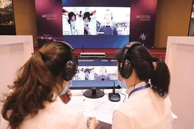 此次全球網(wǎng)絡(luò)招聘會,設(shè)在南京河西一家酒店大廳的40個雅致的白色小格子內(nèi)。每個“格子”即為一家企業(yè),招聘代表的座位前配有電腦、麥克風(fēng)等設(shè)備。翻譯工作人員來回穿梭,現(xiàn)場為視頻另一端不會中文的外籍求職者提供同聲傳譯服務(wù)。