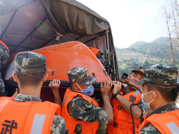 任務官兵卸載沖鋒舟(央廣網發 武警福建總隊龍巖支隊供圖) 目前,任務官兵已完成鋪設阻油索15米,并做好了隨時處置情況的準備。 |