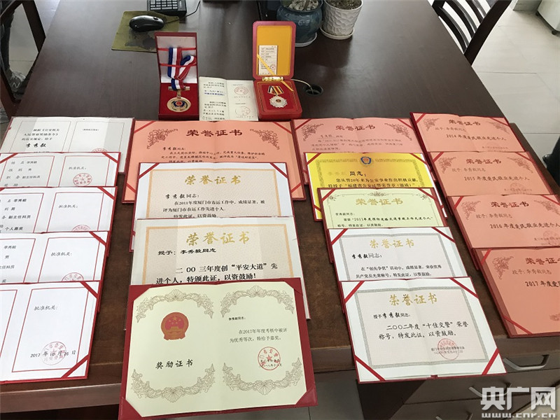 李秀毅生前獲得的部分榮譽獎章和證書(央廣網記者陳庚 攝) 在李秀毅和同事們的努力下,如今,廈門市公安局同安分局交警大隊新民中隊轄區道路交通狀況明顯好轉,以最復雜的工業區為例,交通亡人事故從2018年的15起15人,下降到2019年的5起5人,今年上半年,僅1起1人。 從警25年來,李秀毅先后7次榮獲個人嘉獎、4次獲評“愛民敬業先進個人”,還被評為廈門市優秀人民警察。他的同事們說,他把許多榮譽都讓給了別人,他實際應得的不只這些。 |