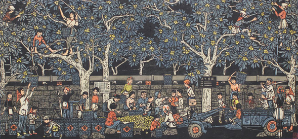 版畫 《五月枇杷滿樹》 楊明義 據(jù)悉,此次展覽在館藏作品中遴選出創(chuàng)作于上個世紀五六十年代至今的版畫和中國畫作品120幅,將分為砥礪奮進、美好生活和綠水青山三個版塊,主要立足于對館藏中國畫和版畫經(jīng)典美術作品的梳理,遵循時代、歷史和美學的線索,見微知著,全方位地呈現(xiàn)社會奮進、祖國河山和人民生活的各個方面。 在江蘇省美術館館長徐惠泉看來,其中有些作品以大尺幅、大構圖著眼于表現(xiàn)水利建設、鋪路架橋、航天工程等宏大敘事;有些則以小見大,聚焦于農(nóng)家豐收、慶賀新居、老有所樂等平凡瞬間;有些則直抒胸臆,記錄于松竹林茂、煙云縹緲、鳥啼蟬鳴等生態(tài)景觀,共同勾勒出社情人文的時代變遷。