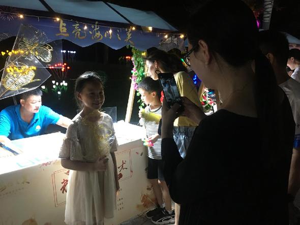 圖片提供:海門區融媒體中心 別樣舞臺展示傳統文化 特色小吃、古玩字畫等小攤位三面環繞主舞臺而立,小龍蝦、燒烤、啤酒,各類主流夜宵,應有盡有。許多人拿著喜歡的小吃,一邊品嘗一邊欣賞琳瑯滿目的小商品,時而看看表演,十分輕松愜意。“這次夜市前期共招募了53家商戶,分為四類:非遺文化類、文創商品類、小百貨、美食街區。”江海文旅公司副總經理商建坤說。 文旅夜市為不少人營造了不可替代的線下活動空間。一些攤主白天可能是公司職員、學生、自營店老板,但到了晚上,他們一齊聚集在這個“文創集市”大舞臺上,呈現自己對于文化產品的理解與堅持。 一旁擺賣紅木小件的攤位前,市民們正拿著手串細細打量,不時和攤主討論著材質、包漿等專業問題。“近幾年,這種擺攤直播推廣文化產業的活動多了起來,我們也有了更多的機會向別人展示這些承載著中華優秀傳統文化的紅木作品,市民對這些產品的了解度和喜愛度目前不斷高漲!蹦贤ù笏渭t木有限公司經理宋浩說。