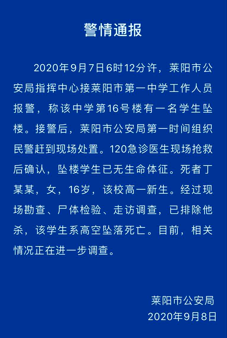 央廣網煙臺9月8日消息(記者劉海奎)9月8日,萊陽市公安局發布通報稱,2020年9月7日6時12分許,煙臺萊陽市公安局指揮中心接萊陽市第一中學工作人員報警,稱該中學第16號樓有一名學生墜樓。接警后,萊陽市公安局第一時間組織民警趕到現場處置。120急診醫生現場搶救后確認,墜樓學生已無生命體征。死者丁某某,女,16歲,該校高一新生。經過現場勘查、尸體檢驗、走訪調查,已排除他殺,該學生系高空墜落死亡。目前,相關情況正在進一步調查。 |