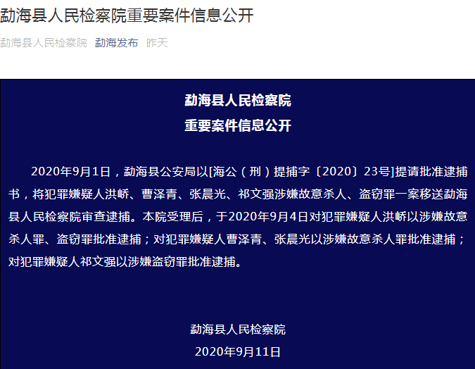 圖為官方通報。勐海縣委宣傳部官方微信公眾號截圖 通報稱:2020年9月1日,勐海縣公安局以[海公(刑)提捕字〔2020〕23號]提請批準逮捕書,將犯罪嫌疑人洪嶠、曹澤青、張晨光、祁文強涉嫌故意殺人、盜竊罪一案移送勐海縣人民檢察院審查逮捕。 勐海縣人民檢察院受理后,于2020年9月4日對犯罪嫌疑人洪嶠以涉嫌故意殺人罪、盜竊罪批準逮捕;對犯罪嫌疑人曹澤青、張晨光以涉嫌故意殺人罪批準逮捕;對犯罪嫌疑人祁文強以涉嫌盜竊罪批準逮捕。 此前,勐海縣公安局于8月4日通報稱,李某月從江蘇南京到達云南勐海后去向不明。初步查明,犯罪嫌疑人洪某與張某光、曹某青在南京合某,張某光、曹某青前往勐海縣于7月9日晚將李某月誘騙至該縣城郊外的山林中殺害并埋尸。 (杜瀟瀟) |