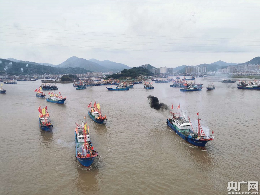 石浦漁港千舟競發(fā)(央廣網(wǎng)記者 杜金明 攝) 央廣網(wǎng)寧波9月16日消息(記者曹美麗 杜金明 通訊員俞莉 陳光曙)55歲的寧波市象山縣石浦鎮(zhèn)漁民陳建勇今天(16日)的中午飯多了兩道菜:炒年糕和紅燒黃花魚!敖裉焓情_漁的日子,我們漁民有這個傳統(tǒng),希望滿載而歸,一年更比一年高! 陳建勇說。 當天中午12點,東海為期四個半月的伏季休漁期結(jié)束,寧波市象山縣1000多艘漁船駛出石浦漁港,直奔東海。 喜迎東海開漁,上午11:30,中國農(nóng)民豐收節(jié)系列活動暨第二十三屆中國(象山)開漁節(jié)開船儀式在石浦港舉行。一曲《龍騰四!防_了儀式的序幕。漁家漢子擂起漁家燈鼓,漁家女子揮舞著長綢扇,他們用這種方式為出海的漁民兄弟祈福壯行。 隨后,大家一起端起酒碗,向即將遠航的漁民兄弟壯行,祝愿他們魚蝦滿倉,幸福安康。兩位飽經(jīng)風霜的老漁民帶領(lǐng)漁姑、漁嫂,向后生輩漁老大大聲喊道:“后方的父老鄉(xiāng)親希望你們柯魚柯得前艙滿、后艙滿!”伴隨著禮炮聲,漁民“一帆風順”“魚蝦滿艙”的吶喊聲,一口壯行酒入喉,千艘漁船首尾相接,直奔東海。