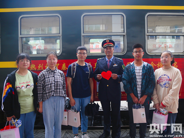 列車工作人員為大學生佩戴上大紅花(央廣網發 通訊員張雁南 攝) “因為今年疫情的原因,讓我萌發了學醫的念頭,最終也如愿被西安醫學院錄取了。”當被問到高考志愿是如何選擇時,家住馬蹄灣鎮的梁欣瑤平靜地說道,“當學有所成時,我還會回到秦嶺,用學到的知識報效祖國,為家鄉的建設貢獻自己的力量。” “向叔叔,梁佳走之前寫了封信讓我帶給您。”臨近略陽車站,封清杰找到向寶林車長,遞上了一張心形卡片。家在白水江鎮的梁佳今年也考上了西安外國語大學,原本和同學約好再坐一次小慢車,可因為臨時有事便提前去了西安,臨走前,她便托同學給向車長帶來一封信。