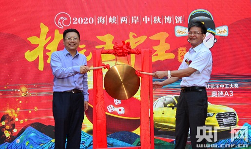 國務(wù)院臺辦新聞局局長馬曉光(左),福建日報(bào)副總編輯潘賢強(qiáng)為比賽開鑼(央廣網(wǎng)發(fā) 主辦方供圖) 央廣網(wǎng)廈門9月22日消息(記者陳庚)2020海峽兩岸中秋博餅狀元王中王大賽20日在廈門兩岸文創(chuàng)園嘉禾良庫開鑼,接下來的一個月里,該賽事將在廈門各大社區(qū)、商場、網(wǎng)紅地標(biāo)、特色商業(yè)街內(nèi)進(jìn)行,并最終舉辦決賽暨王中王總決賽。 “中秋博餅”民俗起源于廈門,后成為海峽兩岸民眾共度中秋佳節(jié)的重要活動內(nèi)容,也是國家級非物質(zhì)文化遺產(chǎn)代表性項(xiàng)目。它通過擲六個骰子的方式,博得狀元、榜眼、探花、進(jìn)士、舉人、秀才共六個等次,是一項(xiàng)游戲法則公平、簡單、有趣,帶有競技游戲性質(zhì)的民俗娛樂活動。