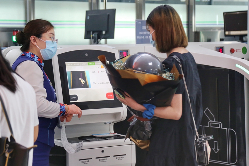 珠海機場工作人員協助旅客辦理自助托運手續(央廣網發 通訊員供圖)