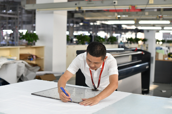 郭軍偉指導徒弟肖爾純電腦制版 榮譽越多,責任越大。郭軍偉現(xiàn)在已經(jīng)是江蘇紅豆實業(yè)股份有限公司襯衫廠的技術(shù)科長、高級版師,但在他眼里,榮譽只代表過去,作為扎根一線的技術(shù)工人,需要不斷挑戰(zhàn)自己,與時俱進實現(xiàn)自我轉(zhuǎn)型,才能持續(xù)領(lǐng)跑。 當他意識到互聯(lián)網(wǎng)時代電腦制版終將發(fā)展為主流并逐漸取代甚至超越手工制版時,主動參加了公司組織的進修學習。他克服學歷低、不會操作電腦的劣勢,最終系統(tǒng)掌握了電腦制版的技術(shù),并結(jié)合手工制版的精細化與電腦制版的效率化,摸索出了高效制版的技術(shù),以前制版需要半天,現(xiàn)在半個小時就能完成。 當他意識到傳統(tǒng)工藝在滿足個性化需求服務(wù)方面的不足時,他提出互聯(lián)網(wǎng)時代只有不斷改進工藝,為產(chǎn)品注入個性化創(chuàng)造理念和情感溫度,才能展示襯衫藝術(shù)的生命。 為了實現(xiàn)突破,郭軍偉常常利用周末到紅豆大學充電,結(jié)合自身需求選修針對最新流行款式、面料、色彩的培訓課程,通過上網(wǎng)查找資料和出差的機會在設(shè)計面料、顏色上不斷創(chuàng)新。 每次供應(yīng)科從國外進口襯衫回來,他都第一時間把樣衣拿來反復研究,將前片、后片、衣領(lǐng)、袖子……化整為零拆分拼接,像研究藝術(shù)品一樣琢磨不同風格的版型優(yōu)勢,經(jīng)過反復對比試驗,成功將襯衫單一版型改良為商務(wù)版、修身版,休閑版、時尚版,從而滿足了不同年齡、層次、身型的個性化、多元化需求,為企業(yè)占領(lǐng)市場、贏得顧客作出了貢獻。 愛“搗鼓”的“多面手” 大巧破難。除了在制版領(lǐng)域精益求精,近年來,郭軍偉還在技術(shù)創(chuàng)新上小有成就。為提高車間生產(chǎn)效率,他以近乎癡迷的執(zhí)著在車間和工作室“搗鼓”各種生產(chǎn)小工具,累計已達8種。 制版前準確測量面料縮水率,對提高版樣精準度非常重要。為提高測量效率,他想出用一個50x50公分的玻璃板作為測量面料縮水率的標準工具。“玻璃板中間設(shè)置了很多排列規(guī)則的小氣孔,這樣壓上去可以將玻璃板和面料之間的氣泡排空,保證面料的平整度。非水洗面料,標注好經(jīng)緯度后直接拿去用蒸汽熨燙一下,但蒸汽時候不能抽風,這樣測出的數(shù)值更加精準;水洗面料,需要水洗一下,烘干后再測量。然后對比熨燙前后的標注,可以快捷的計算出面料縮水率。”郭軍偉說,這樣的小工具簡單實用,但使用中也常常需要“用心”觀察,把握細節(jié),才能保證樣板數(shù)據(jù)更加精確。