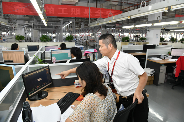 郭軍偉用玻璃板測量面料縮水率 為襯衫車間每一臺電動縫紉機配一塊形狀略有不同的小鐵片也是他的杰作。這個被稱之為“小籠頭”的小改造在不同的機器上發(fā)揮出神奇的作用,里巾籠頭、后背籠頭、裝袖口籠頭、卷下巴籠頭……有了這塊寸把長的“小籠頭”,工人們不管是做下擺、袖口還是后背卷邊都更均勻、更平整、更快速,還省去了熨燙環(huán)節(jié)一道燙的工序,從前需要3-4個人的流水作業(yè)現(xiàn)在只需要1-2人即可完成。這些“小籠頭”不僅凝聚了他的智慧,更凝結(jié)了他帶領(lǐng)車間機修師傅們鉆研改造的工作結(jié)晶,在他的引領(lǐng)下,紅豆工友革新創(chuàng)造的興趣日益濃厚,而這些“小小”成果的運用卻大大節(jié)約了企業(yè)的人資成本,提高了工作效率。 “贏在務(wù)實,他是襯衫‘骨骼’塑造者” “設(shè)計到制版,零誤差;制版到樣衣,不出一個次品。”敬業(yè)、嚴謹、專注、求精,郭軍偉在平凡的工作崗位上傾盡全力,發(fā)揚勞模和工匠精神,同時,他毫無保留地將技術(shù)和經(jīng)驗傳授給員工,讓他們獨當一面并持續(xù)發(fā)光發(fā)熱。 2011年,以郭軍偉命名的大師工作室掛牌成立,他的“師帶徒”事業(yè)有了新的陣地,累計培養(yǎng)企業(yè)技術(shù)尖子6名、生產(chǎn)一線技術(shù)能手50余名。他收徒弟,要求只有一個:先學會做人再學會做事。在他看來,傳承不僅僅是技術(shù)傳承,更重要的是精神傳承,技藝精進固然重要,高尚的人格、共享的精神、互助的理念、踏實的作風更加寶貴。 “跟大師學徒很有壓力,但他的務(wù)實、勤勉,讓我對版師的職業(yè)前景充滿信心。”畢業(yè)于徐州工程學院服裝設(shè)計專業(yè)的肖爾純,是郭軍偉帶的第7名徒弟,當初她的職業(yè)理想是跟服裝設(shè)計有關(guān),入職紅豆后,被分配到技術(shù)科跟著郭軍偉學制版,剛開始她還有點失落感。郭軍偉對徒弟要求很嚴,3個月來,肖爾純每天被師傅逼著“動手”:從最基礎(chǔ)的制版技巧,到練習剪刀,再到上流水線裁剪衣服,反復練習。 “對我的一次次試錯,郭師傅總是不厭其煩地給予講解和點撥。”肖爾純說,郭師傅在傳授她制版技巧的同時,還融合傳授設(shè)計、面料等多方面積累的“經(jīng)驗”,這讓她成長很快,對版師職業(yè)前景充滿信心。