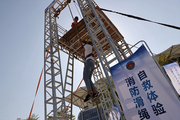 市民在體驗消防滑繩自救(央廣網發 曾德猛 攝) 啟動儀式現場還推出新型消防裝備展示、搜救犬表演、VR火災模擬體驗、高臺逃生、結繩法體驗等數十種趣味性、實用性挑戰項目,并為2020年廈門市兒童消防安全主題繪畫征文比賽獲獎作品頒獎。現場還設置咨詢臺,發放《防火滅火逃生攻略》等宣傳資料,“高人氣”的消防常識有獎問答區,被市民們團團圍住,在義工們的組織下,大家玩游戲、漲消防知識、贏獎品,不亦樂乎。 當天,廈門市海滄區“2020年‘119’消防宣傳主題活動暨全民消防技能大比武決賽”也同期舉行,來自該區重點單位、社區(村)微型消防站、企事業單位的143名參賽選手,經過半個月的海選、初賽、復賽層層淘汰來到現場,角逐團體初戰滅火實戰操、個人闖關操等項目總決賽,展示了頑強拼搏、積極進取的精神風貌和較高的消防技能水平。