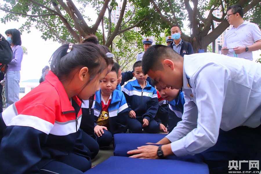 師生在觀摩森林消防員疊“豆腐塊”(央廣網(wǎng)發(fā) 通訊員供圖)