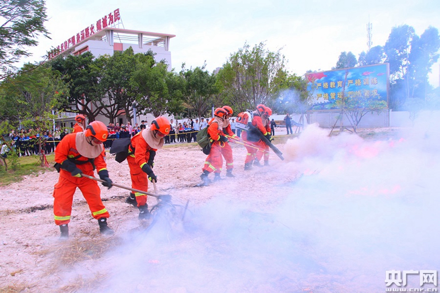 森林消防員開始班組滅火行動(央廣網(wǎng)發(fā) 通訊員供圖) 當天,師生們走進營區(qū),先后參觀了消防員宿舍、食堂、滅火救援裝備、班組滅火戰(zhàn)斗和隊列表演。在滅火裝備區(qū),師生們拿起風(fēng)力滅火機、電動水槍和高壓細水霧,在消防指戰(zhàn)員的講解下進行體驗。在模擬火場上班組滅火戰(zhàn)斗環(huán)節(jié),只見消防員們首先利用風(fēng)速90米/秒的風(fēng)力滅火機吹散堆積的可燃物,然后用電動水槍進行降溫、保濕作業(yè),防止林火再復(fù)燃,并仔細清掃煙點。指戰(zhàn)員們配合默契,引來師生們的熱烈掌聲。