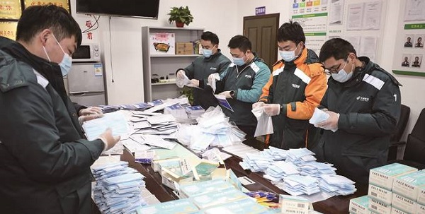疫情防控期間,淮安郵政快遞工作人員分裝平價口罩。