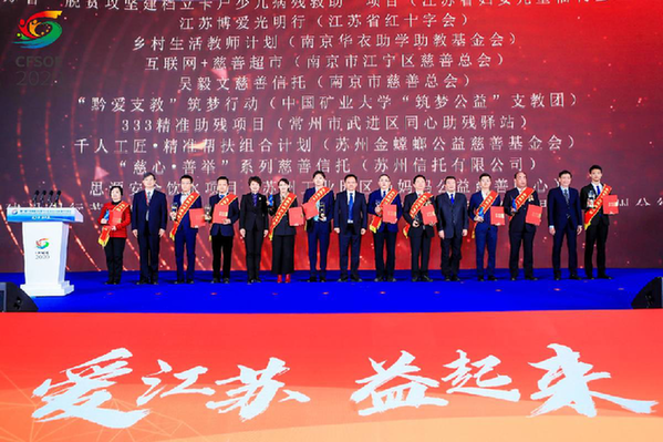 開幕式現場。 趙世勇在致辭中表示,近年來,江蘇省委、省政府將慈善事業作為促進社會組織參與社會救助、改善基本民生的重要方面,作為“強富美高”新江蘇建設的重要內容,認真組織實施《慈善法》,加強慈善制度建設,加快慈善組織發展,推進慈善文化傳承,著力發揮慈善作用,推動江蘇慈善事業蓬勃發展。他說,要堅持以人民為中心的發展思想,把發展慈善事業擺在重要位置,優化完善工作機制,健全慈善行為褒揚獎勵制度和鼓勵措施,推動形成“人人能慈善、人人可慈善”的濃厚氛圍,為促進人的全面發展和共同富裕貢獻慈善力量。