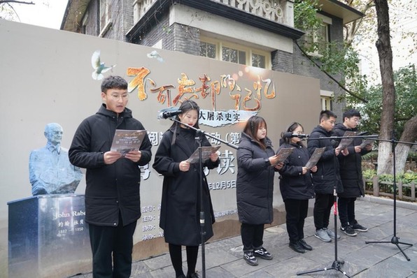 南京大學拉貝紀念館暨拉貝國際和平與沖突化解研究交流中心主任楊善友講解 來自南京工程學院的大學生讀書會成員朗誦了詩歌《拉貝的訴說》。