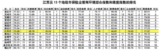 14日,江蘇省銀保監局聯合南京大學共同發布了《2020江蘇保險業營商環境評價報告》(下文簡稱《報告》)。《報告》顯示,在滿分100分的情況下,2020年江蘇省保險業營商環境綜合指數為73.28,受疫情影響,這一指數較去年下降0.18,整體處于良好水平。南京、蘇州、無錫、常州、宿遷、南通和淮安等7個設區市保險業營商環境綜合指數高于全省平均水平。