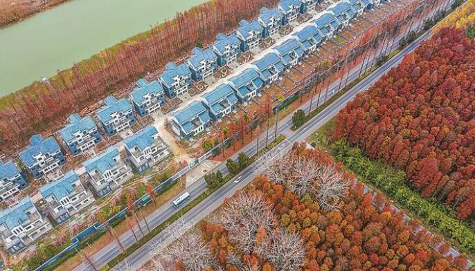 泗洪青臨線旅游路兩旁,紅色的水杉樹與藍色的新民居交相輝映。 (張連華 張笑 攝)