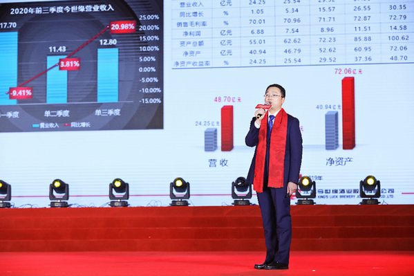 今世緣酒業(yè)黨委副書記、副董事長、總經(jīng)理顧祥悅主持會議(席航飛 攝) 回眸“十三五”:今世緣交出一份優(yōu)秀答卷 周素明在報告中發(fā)布企業(yè)“十三五”發(fā)展答卷: 主要指標再創(chuàng)新高。營收實現(xiàn)翻番,利稅同步翻番,企業(yè)總資產(chǎn)從2015年的54億元增長到2020年的100億元以上;市值從2015年的168億元增長到目前的700億元左右,順利完成“十三五”主要目標任務。 市場營銷進中向好。構建了“國家級平臺為傳播高地,省內(nèi)及周邊高速高鐵為落地主體,公關事件與新媒體傳播為重要補充”的融媒體傳播矩陣,形成高端化、多維度、廣覆蓋的傳播格局。省內(nèi)市場全面精耕,終端覆蓋率、市場占有率普遍提升;省外市場重點突破,銷售規(guī)模增長近兩倍,客戶數(shù)量倍增。 科技創(chuàng)新卓有成效。致力以科技創(chuàng)新賦能傳統(tǒng)釀造工藝,釀酒智能化走在行業(yè)前列,“固態(tài)發(fā)酵濃香型白酒釀造關鍵技術的研發(fā)和應用”項目獲得中國酒業(yè)協(xié)會科技進步一等獎;以品類戰(zhàn)略創(chuàng)新為引領,開創(chuàng)國緣V9清雅醬香新品類,積極參與白酒業(yè)頭部競爭。 卓越管理再上臺階。持續(xù)深化卓越績效管理,榮獲十七屆“全國質(zhì)量獎”,榮膺“全國文明單位”稱號,蟬聯(lián)“中國主板上市公司價值百強”“中國上市公司最具投資價值企業(yè)金牛獎”“世界美酒特色產(chǎn)區(qū)”漣水縣榜上有名,入選2019年江蘇省企業(yè)社會責任建設典范榜。